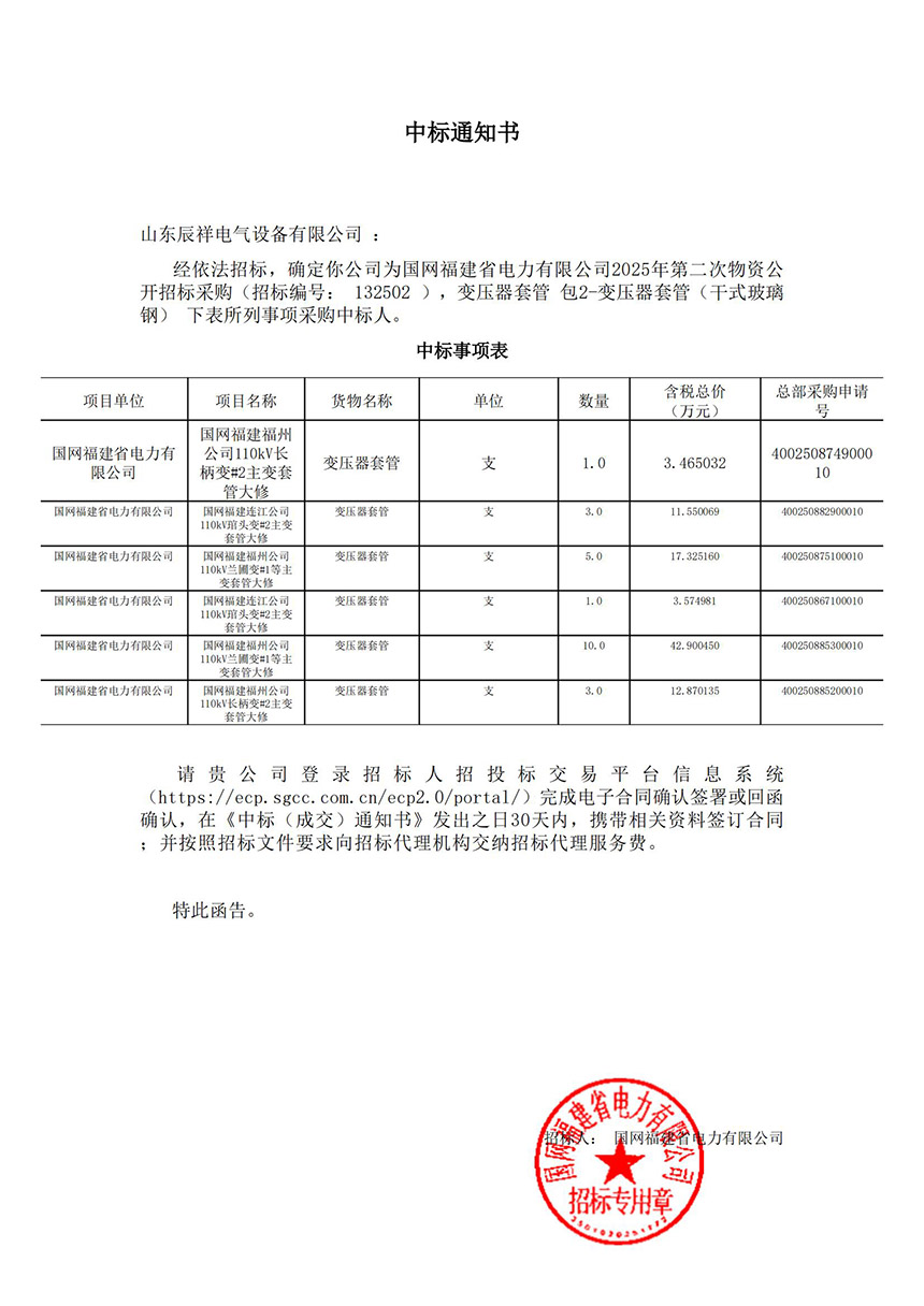 2025.02.14 110kV瓷絕緣穿墻套管中標通知書